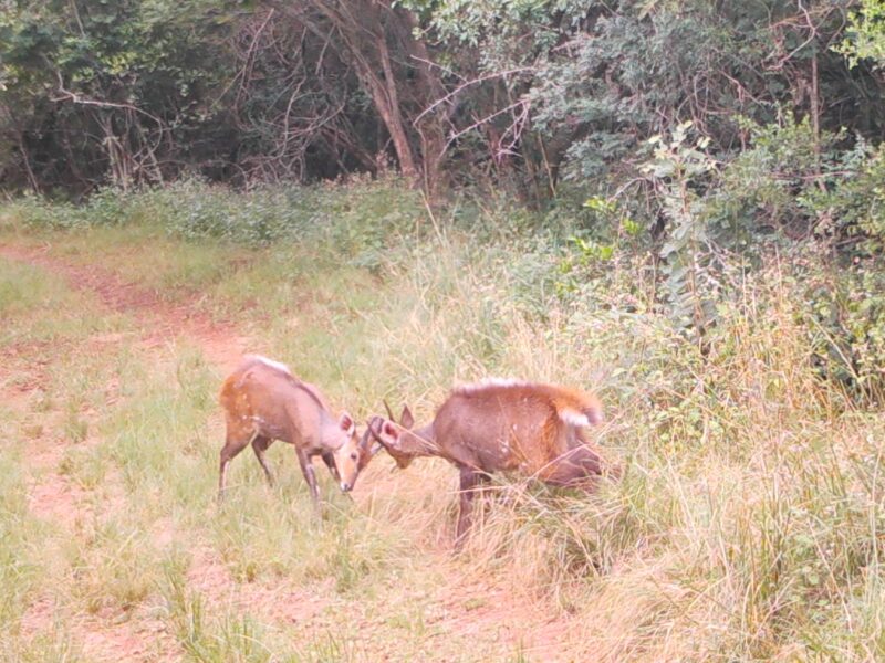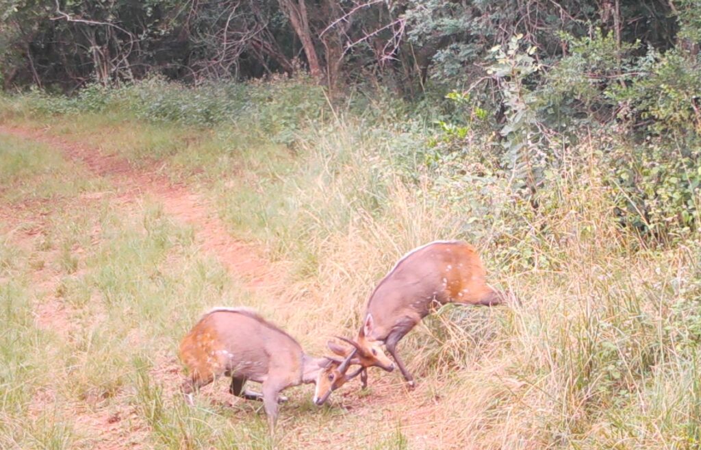 Observing bushbuck sparring will be pretty wild, but luckily, while we were not watching a trail camera was. These two bushbuck (Tragelaphus scriptus) rams were having a heated argument and with horns as sharp as knives they could easily have injured each other. Luckily most fights are a ritualistic display where young adult males may challenge other and older territorial males to replace them in order to take over their home ranges. Or territorial males may initiate combat when challenged by a younger male.