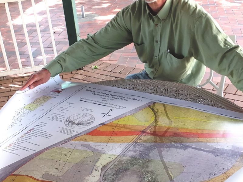 Slowly but surely a detailed picture of the geology of Mountainlands Nature Reserve is being unveiled thanks to the efforts and contributions of Prof Christoph Heubeck from Jena University and students from this university and from his former workplace, the Freie Universität Berlin, Germany. Recently, Prof Heubeck presented us with a new geological map of the western part of Farm Dycedale, accompanied by the supporting bachelor theses of two students from the Freie Universität Berlin.